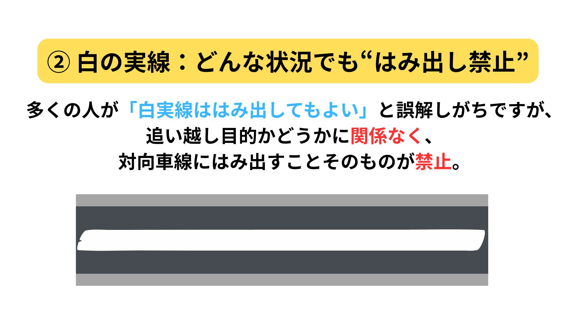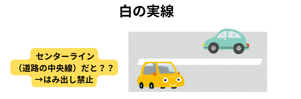 白の実線は黄色の実線とは異なり、追い越し目的かどうかに関係なく、対向車線にはみ出すことそのものが禁止。安全確認ができても、白の実線をまたいではいけません。