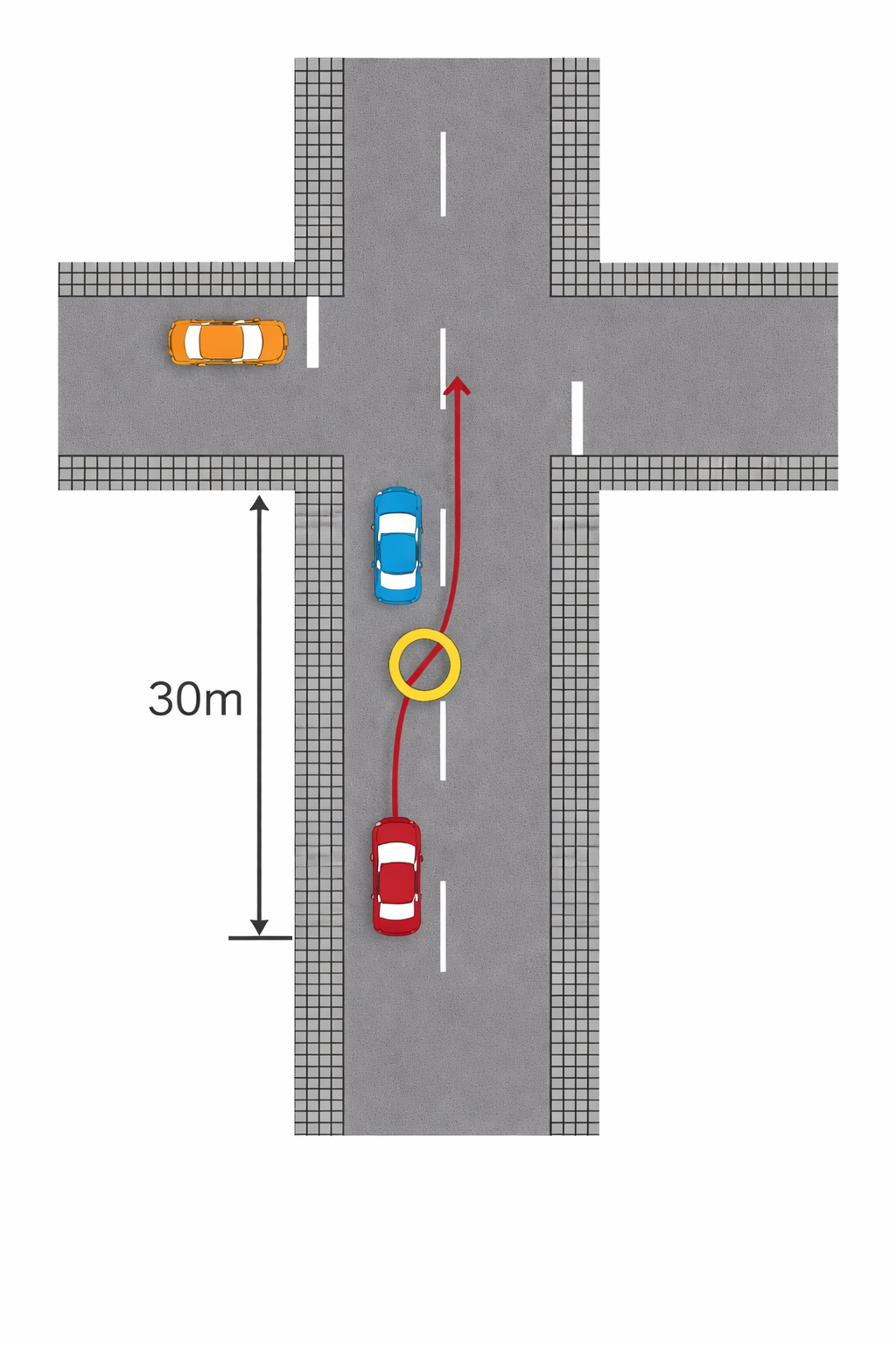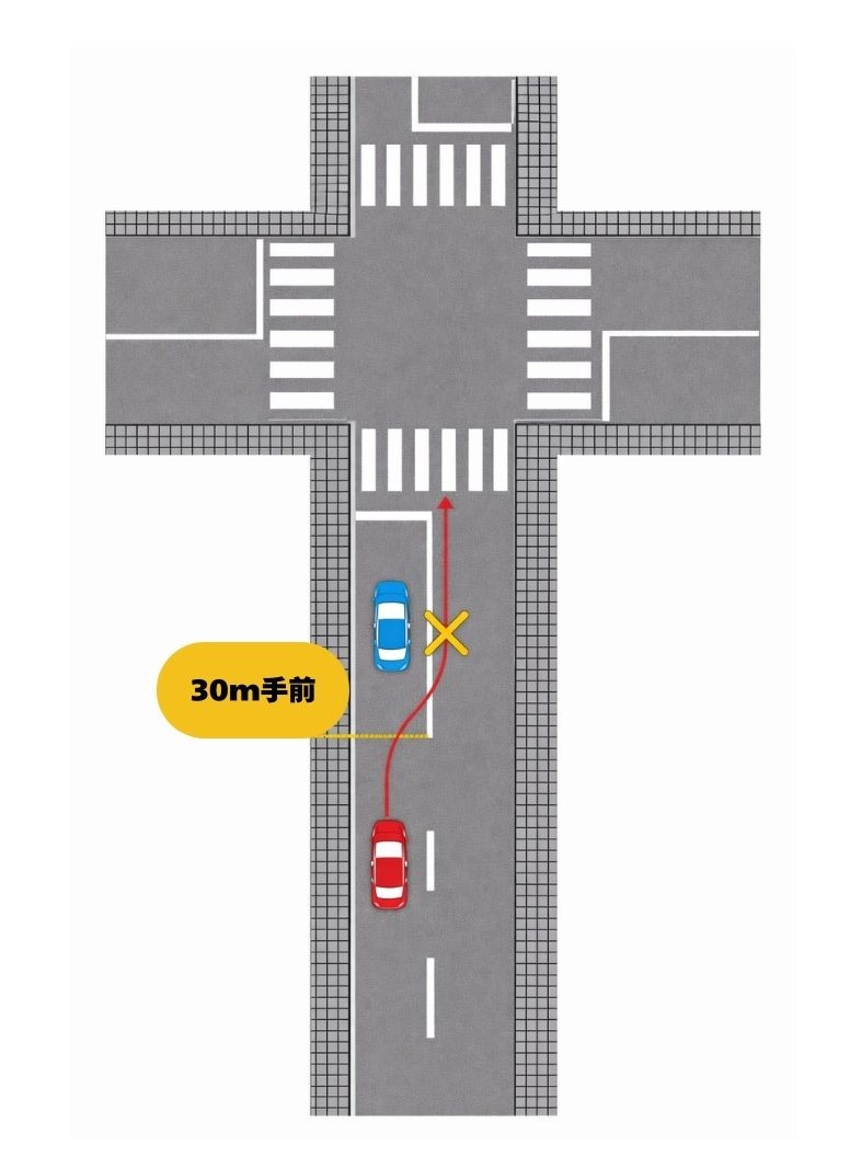交差点とその手前30mは、原則として 追い越しが禁止されています。